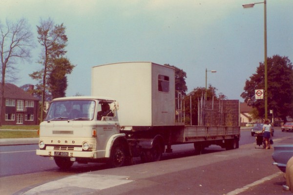 | Details: Bus stop renewal duties in the 1970s were often carried out using special trailer K1 and one of the Ford D articulated tractor units. 1684F of 1971 was a favourite for this role and was seen with K1 carrying a dead shelter outside Bromley Garage. | ||||