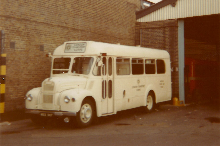 | Details: Briefly mentioned last month, two photos of this vehicle are being added today. MXX347 was formerly bus GS47. After withdrawal it was converted into an ambulance for use by the London Transport Corps of the St Johns Ambulance service. Repainted white, it seems to have been kept on LT premises. Unfortunately both of the images were scanned from rather small originals, hence the lettering and details are not clear. Showing the nearside is this view of MXX347 taken at Turnham Green Garage on 26th September 1971. | |||