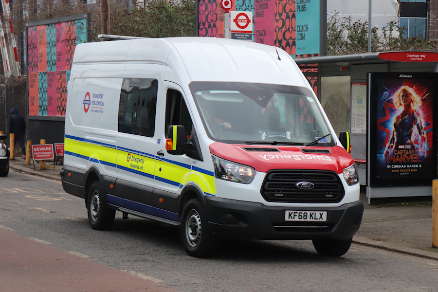 | Details: The LUL Emergency Response Unit took delivery of a new Ford Transit Mk8 crew van in February 2019, presumably to replace Mk7 van 7726F. The livery is very similar except that the yellow/blue stripe is applied at a slope, rather than parallel. 8684F was caught approaching Acton Works on 5th March 2019. | |||