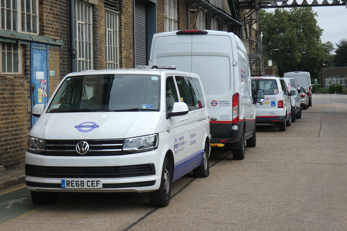 | Details: This photo was taken from near the traverser in Acton Works, looking back towards the DSM offices. The girder at the top of the photo spans between two of the larger buildings and appears in many photos, while the LBSL vehicle parking area is off-frame to the right. A line of service vehicles parked here was headed by TfL Volkswagen Transporter minibus 8714VW, based at Victoria for taxi and minicab compliance checks. It carries the attractive white/blue/lilac livery variation, and it seems to have a flat tyre, perhaps explaining its presence here. Beyond that is a high-roof Ford Transit van, then another Transporter minibus and a Ford Transit Custom van, all three in LUL livery. Note that the low-roof variants of the Transporter and Transit Custom are almost identical in height. | ||||