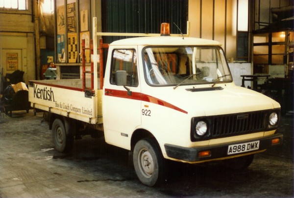 | Details: Kentish bus was the new name for London Country South East, first used from April 1987. The rebranding was complete, involving the company name, route and fleet numbers and livery. Showing the cream and maroon scheme is Freight Rover Sherpa dropside 922 (A988DMX), seen at Northfleet garage on 14th January 1989. | ||||