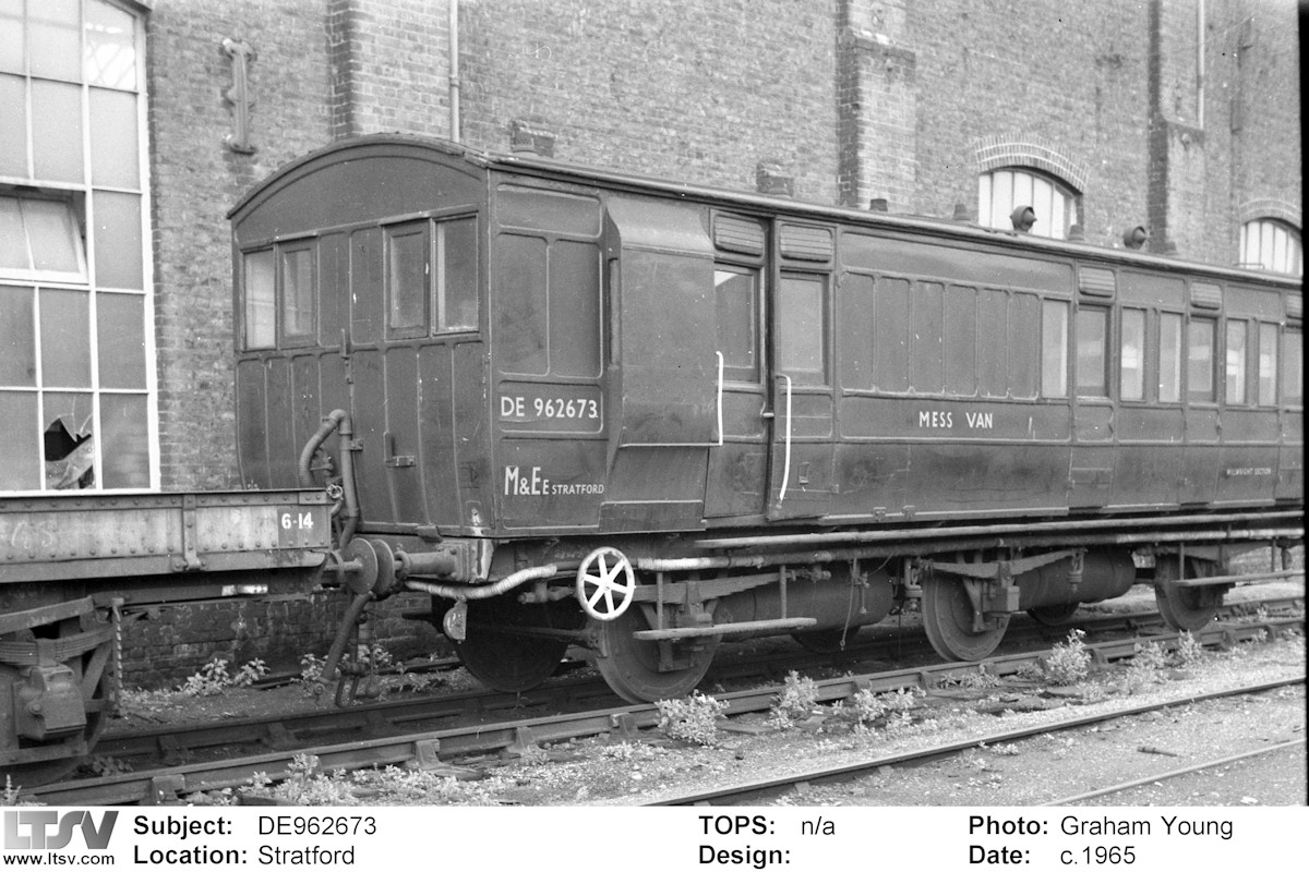 Notes: | DE962673 at Stratford in about 1965. Not listed by Longworth but believed to be an ex GER 6-wheel Brake Third. |