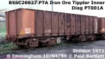 Batch: BSSC26000-BSSC26094 Batch: BSSC26095-BSSC26099 Batch: BSSC26100-BSSC26104 Batch: BSTE26450-BSTE26541 Batch: BSTE26542-BSTE26552 Batch: BSTE26553-BSTE26563 Batch: BSSW26564-BSSW26665 Batch: BSSW26666-BSSW26671 Batch: BSSW26672-BSSW26677 Batch: BSRV26678-BSRV26778 Batch: BSRV26779-BSRV26789 Batch: BSRV26790-BSRV26800 Batch: PR26801-PR26850 TOPS Class/Code: JTA-E P.O. Ironstone Tippler, bogie, end vehicle, rotary coupling TOPS Class/Code: JTA-F P.O. Ironstone Tippler, bogie, end vehicle, no rotary coupling TOPS Class/Code: JUA-D P.O. Ironstone Tippler, bogie, (42ft. overall length) TOPS Class/Code: PTA-D Bogie Ironstone Tippler, 42ft TOPS Class/Code: PTA-E Bogie Ironstone Tippler - End Vehicle - Rotary Couplings TOPS Class/Code: PTA-F Bogie Ironstone Tippler - End Vehicle |