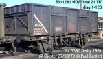 Despite the recommendations of the Ideal Stocks Committee, construction then reverted to the less economic but more flexible 21ton design. The body was changed to have top flaps over the side doors, and vacuum brakes were specified. Shildon built 1000 wagons in 1961/1962 to diagram 1/119. The earlier number range could not be used as the burgeoning 16ton mineral construction programme had taken the numbers from B203000 upwards in 1953. Curiously the new numbers allocated were B310000-B310999, although the range from B300000 upwards was free. Very soon afterwards, Derby started work on a batch of 1000 wagons to diagram 1/120, identical save for the fitting of self-adjusting vacuum brakes. This lot (3390) was later cut back by 50 wagons, the underframes that would have been B311950-B311999 appearing instead as Coil A wagons B949130-B949179. Derby and Shildon built three further batches of 21ton minerals in 1962/1963, adding wagons B312000-B314999.