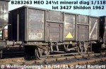 The fleet of 24.5ton mineral wagons, which had been assigned TOPS code MEO, was also the subject of some late rebodying. 651 wagons were fitted with new bodies to the simplified layout described above, retaining their oiginal numbers. Also in 1977, two lot numbers were issued for the construction of new 25 tonne mineral wagons on a variety of redundant underframes. The source wagons included 21 and 24.5ton minerals and 24.5ton hopper and the new bodies were to the simplified design, although it would appear from photographs that these were to the lower height as used for the original 21ton mineral wagons. To distinguish their greater capacity, the rebuilds were given new numbers in the B290000-B290485 range, although not all numbers were in the event used. Curiously, despite their increased capacity, the wagons were coded as MDO/MDV. In any case, most were later downrated to 21tons (or 21.5tons). Most of the rebuilds were MDOs to lot 3920 but three were MDVs to lot 3921, the source wagons being older MDVs. These were numbered B290200, B290210 and B290214, none of the other numbers between B290200 and B290219 being used. All three were later transferred to departmental use as ZHV, this code being mainly used for former 16ton minerals. The trio reverted to MDVs in 1986.
