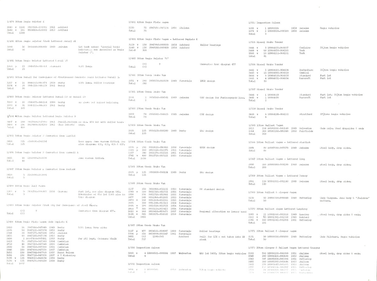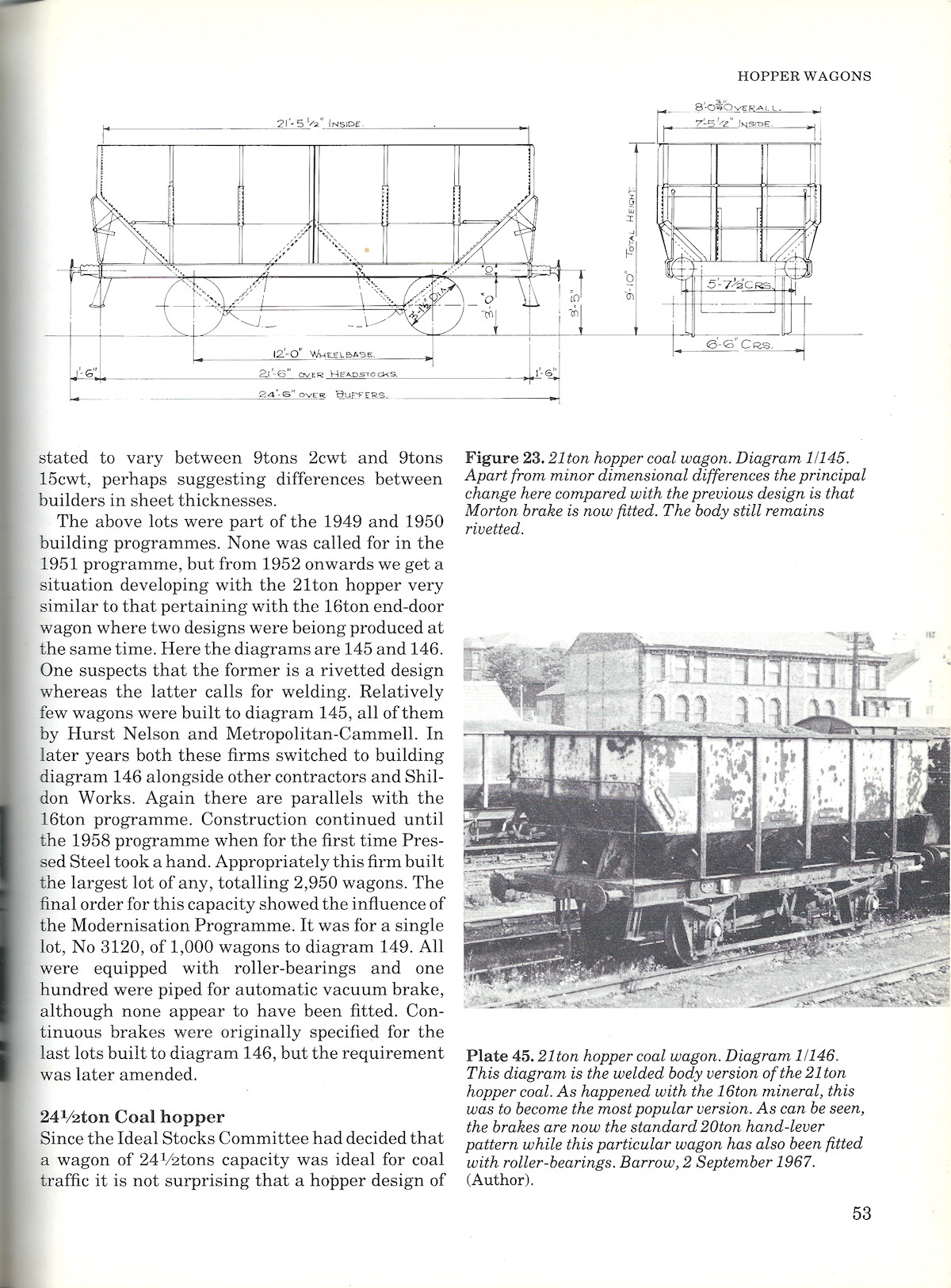 Review: | 1985 was a good year for wagon books, with two major titles appearing. The first was actually written in 1982 and is an excellent overview of the entire BR wagon fleet from 1948 until about the mid-1960s. As the sub-title suggests, this book focuses more on the 'golden era' of wagon building, and consigns all developments since the introduction of air-brakes to a final chapter headed Apocrypha. In its favour the book does include chapters on departmental wagons and containers, and all chapters are littered with drawings (121 in total, reproduced at 1:76 scale). Most of these are derived from the BR diagrams and lack underframe details and plan views although some very interesting types are included. Another strength of this book is the appendices. The first lists the mineral wagons inherited from the Ministry of War Transport. The second lists all the number ranges used on BR wagons in this period with the lot numbers for each. The third correlates lot numbers to diagram numbers, and the fourth lists all the diagrams with numbering and build details. The mid-1960s cut off means that some types are ommitted but these appendices form a reference that I still use quite regularly. |