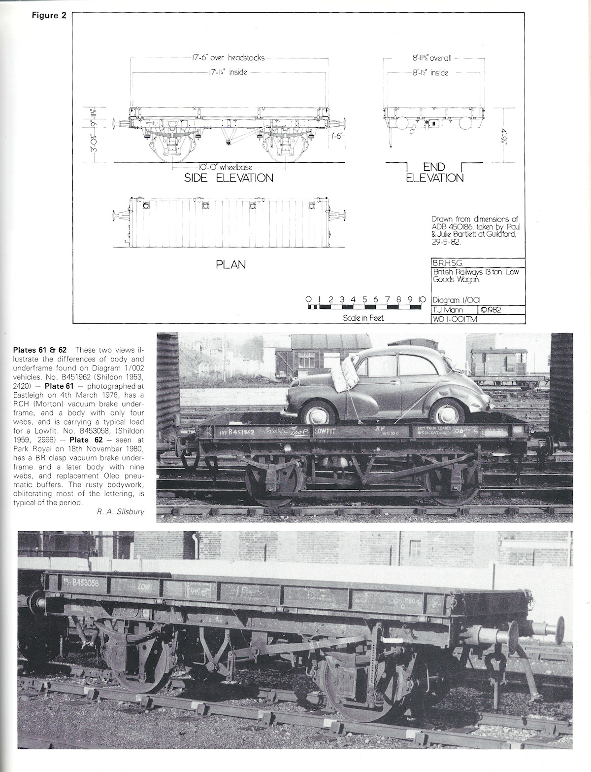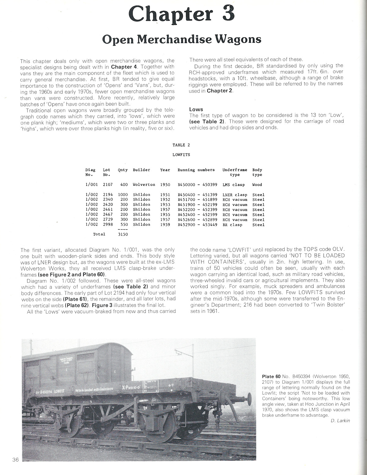 Review: | The second title to appear in 1985 was a combined effort by some of the big names in wagon research at the time, and it feels like a more quality production, with larger pictures on glossy paper and more detailed drawings. Unfortunately this book only covers part of the fleet (open wagons, tanks, steel and mineral wagons). The promised volume two (which would have covered hoppers, vans and non-steel carrying specials as well as detailing the liveries) never appeared. This does mean that more detail could be included though, and this starts with the chapter looking at construction and components which has numerous photos of axleboxes, buffers and bogies; very useful for modellers. Subsequent chapters look at groups of types, with tables listing the build and numbering details. Unlike the David & Charles book, this title includes modern types in the appropriate sections. The excellent drawings by Trevor Mann (55 in total) are again to 1:76 scale and include underframe details and plan views. |