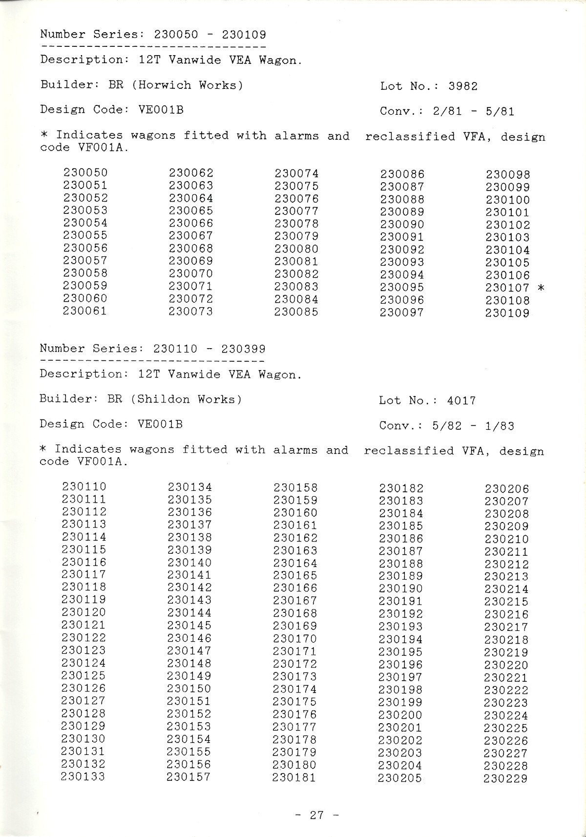 Typical inside page, with lists of numbers arranged into lots. Information on individual variations is given by the use of symbols. 19 of the pages in the book are like this. Note that the former identities of converted wagons (such as the VEAs shown here) were not given, while those for the ODAs were.