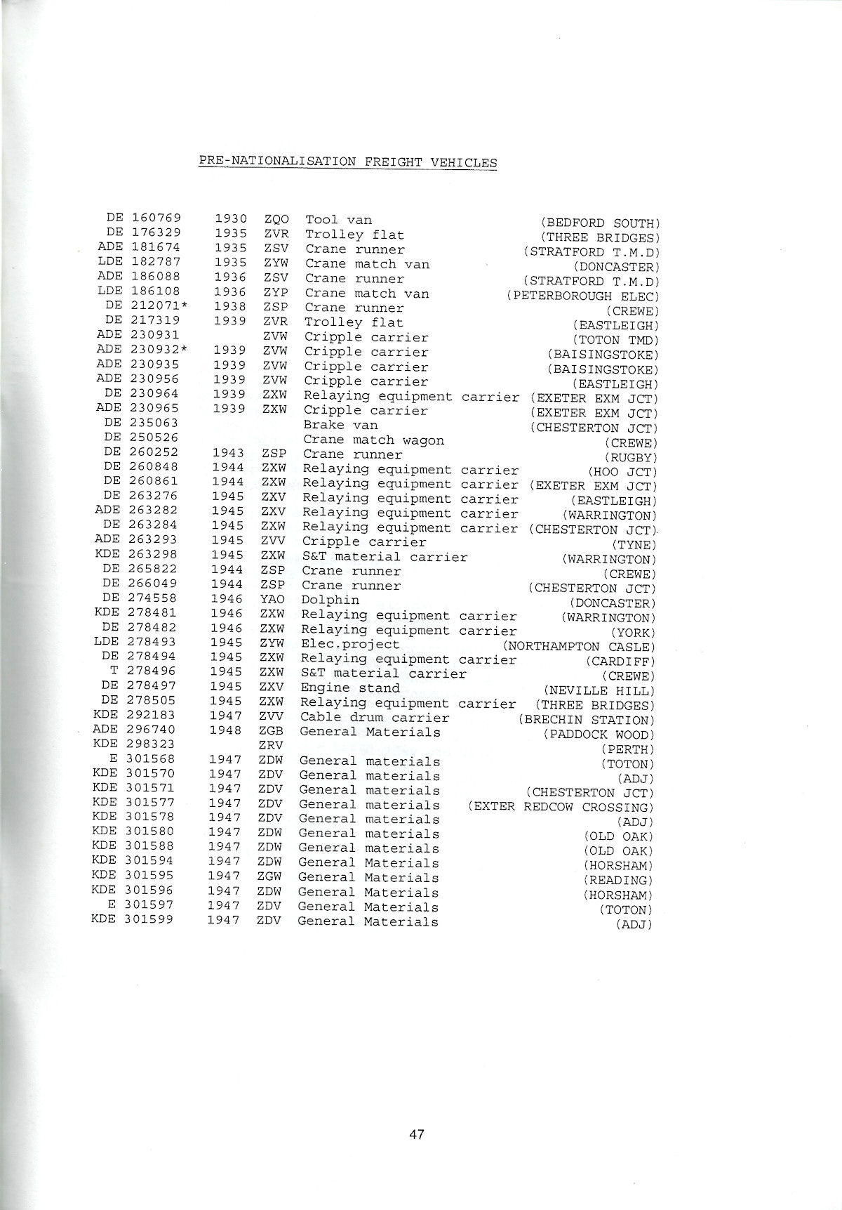 Pre-Nationalisation wagons were put in continuous lists since very few sizeable 'batches' remained. Prefixes, build dates, TOPS codes, descriptions and locations were all provided.