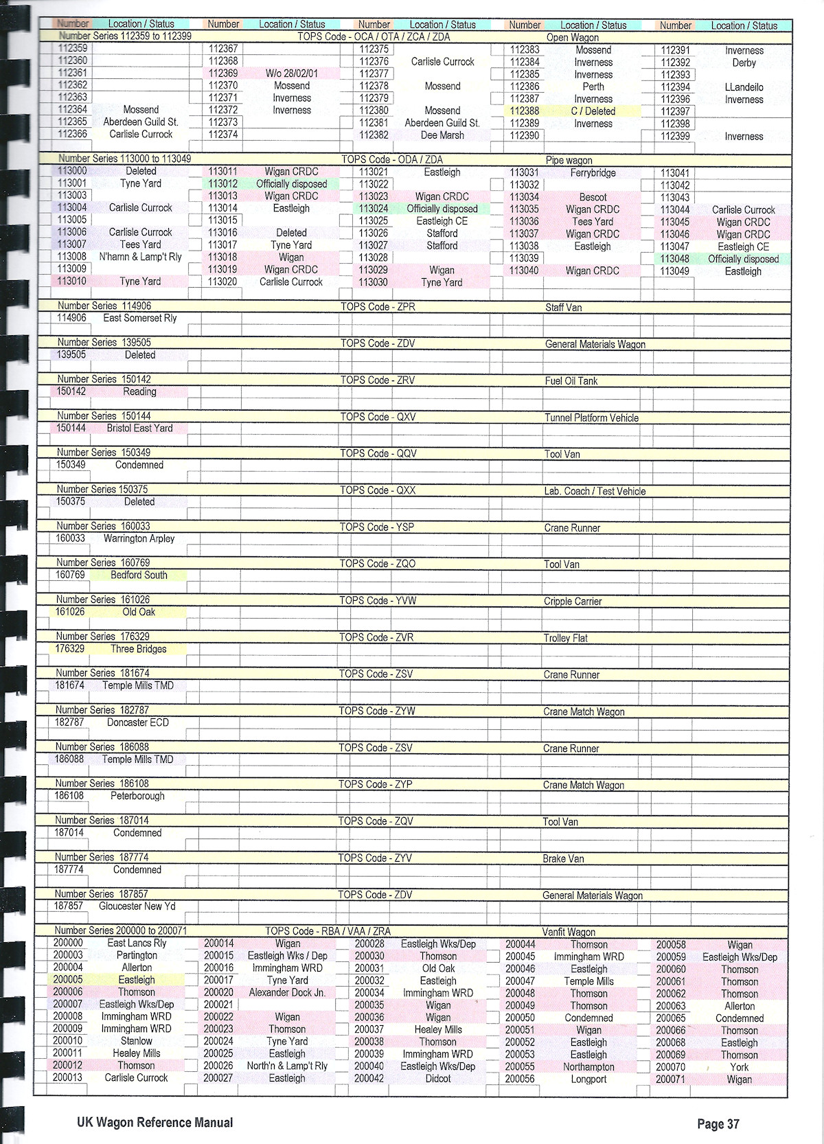 Review: | This comb-bound, 166 A4 page book with laminated covers is a valiant effort to catalogue all recent domestic wagons in the UK. It is printed to order so is always up to date and the price of around £20 includes several sheets of updates through the following year. The pages are evidently produced from a spreadsheet program and there is a complex method of colour-coding to show the status of each wagon. 14 different colours are used to indicate different meanings, but several of the shades are too similar to each other. As there are five columns per side, the amount of space for additional information is limited. Although relatively compact, there are a number of issues which mean that this cannot be seen as a definitive 'reference manual'. Firstly, RIV wagons are not included. The listings are purely numerical with no prefixes (although PO prefixes are outlined in each batch header). This makes it had to identify the pre-nationalisation wagons that are scattered throughout the number ranges. Similarly, TOPS codes of individual wagons are not shown, being dealt with in the same way as the AES book reviewed elsewhere. The book shows wagons that have been disposed of in recent years but with no indication of when (or indeed what the cut-off date is). Most importantly, only one piece of information can be shown against each wagon. This means (for example) that a renumbered wagon in service will show the previous number, but one that is in store will show the storage location. This book may suit some but I would prefer to have paid twice as much for something with twice as many pages and more complete information. |