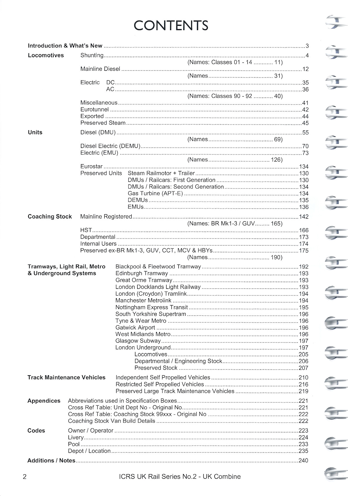Review: | With quite a few companies now producing number listing books, customers can choose titles that suit their requirements in terms of which stock is covered and how much detail is included. This book by the Inter City Railway Society is fairly comprehensive in both respects. It lists not only all main-line registered locos, coaches and units but also preserved and 'industrial' (ex-mainline) locos (including steam), most preserved coaches and multiple units, track machines (including preserved items) and the stock of all the tram, light-rail, metro and underground systems (including London Underground and, again, including preserved stock). For most stock, the owner/operator, allocation and livery is shown, the last being particularly detailed. The list of livery codes runs to 9 pages, with distinctions made between even minor variations. For locos, all previous identities are shown, as are pool codes and technical differences. The last reported location of all preserved stock is also given. |