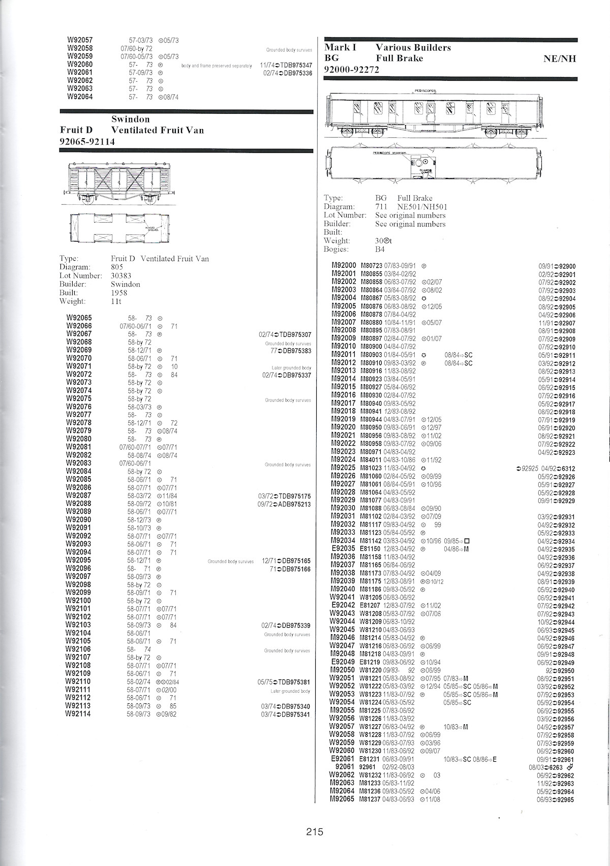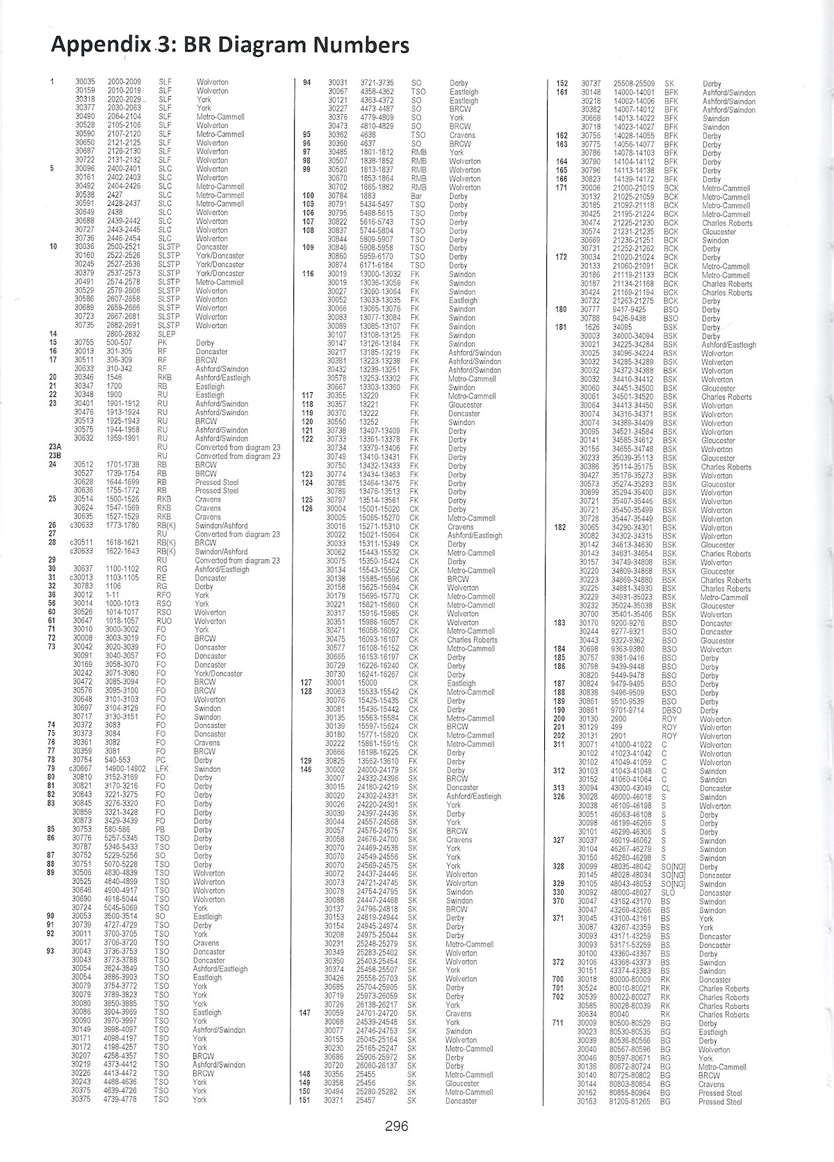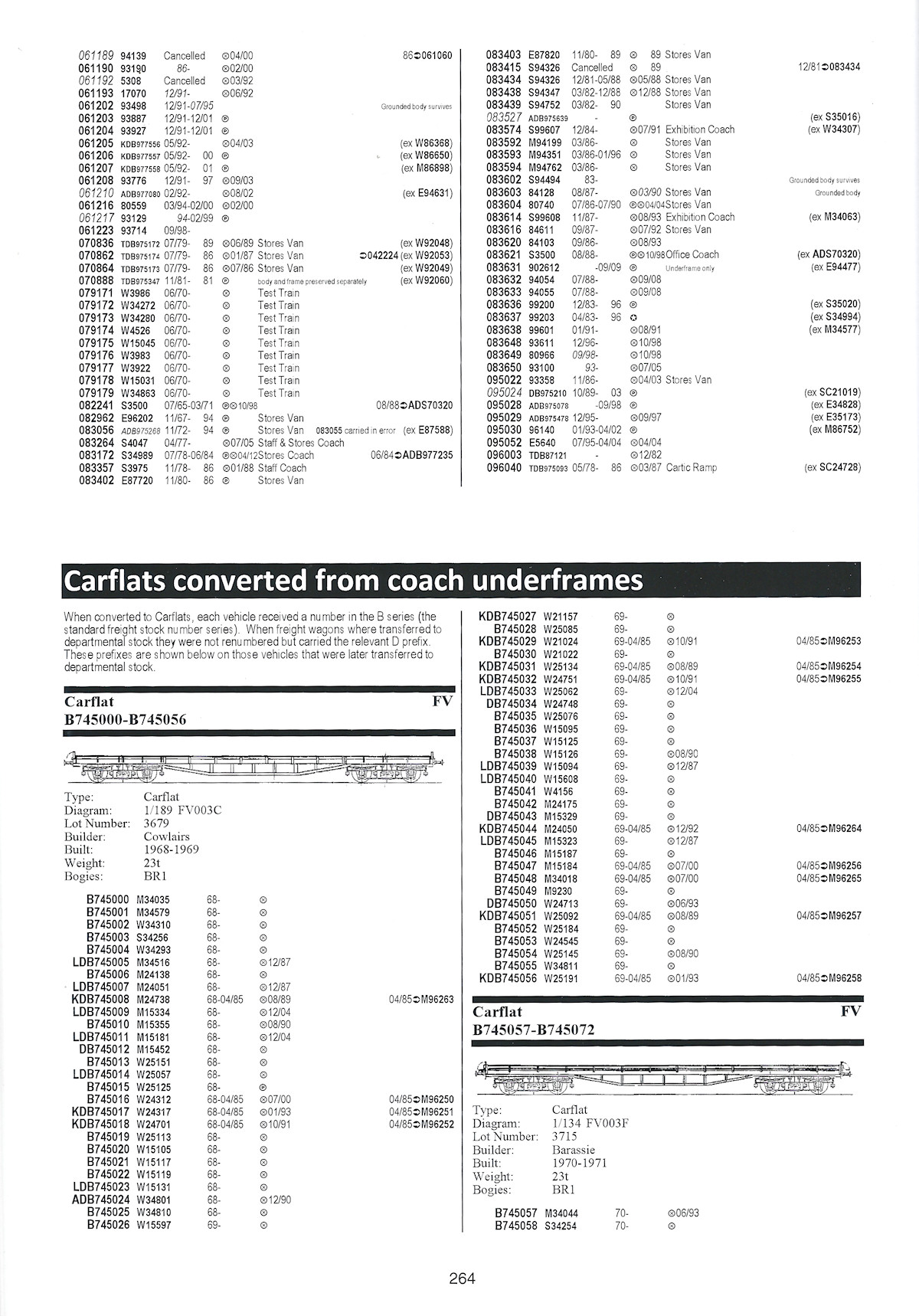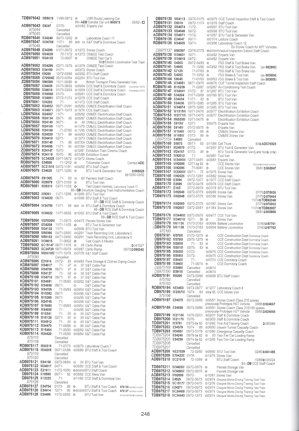 Non-passenger carrying stock is included, with all renumberings shown with dates. Other dates are for into service, withdrawal and disposal. Changes of regional prefix are also given, again with dates.