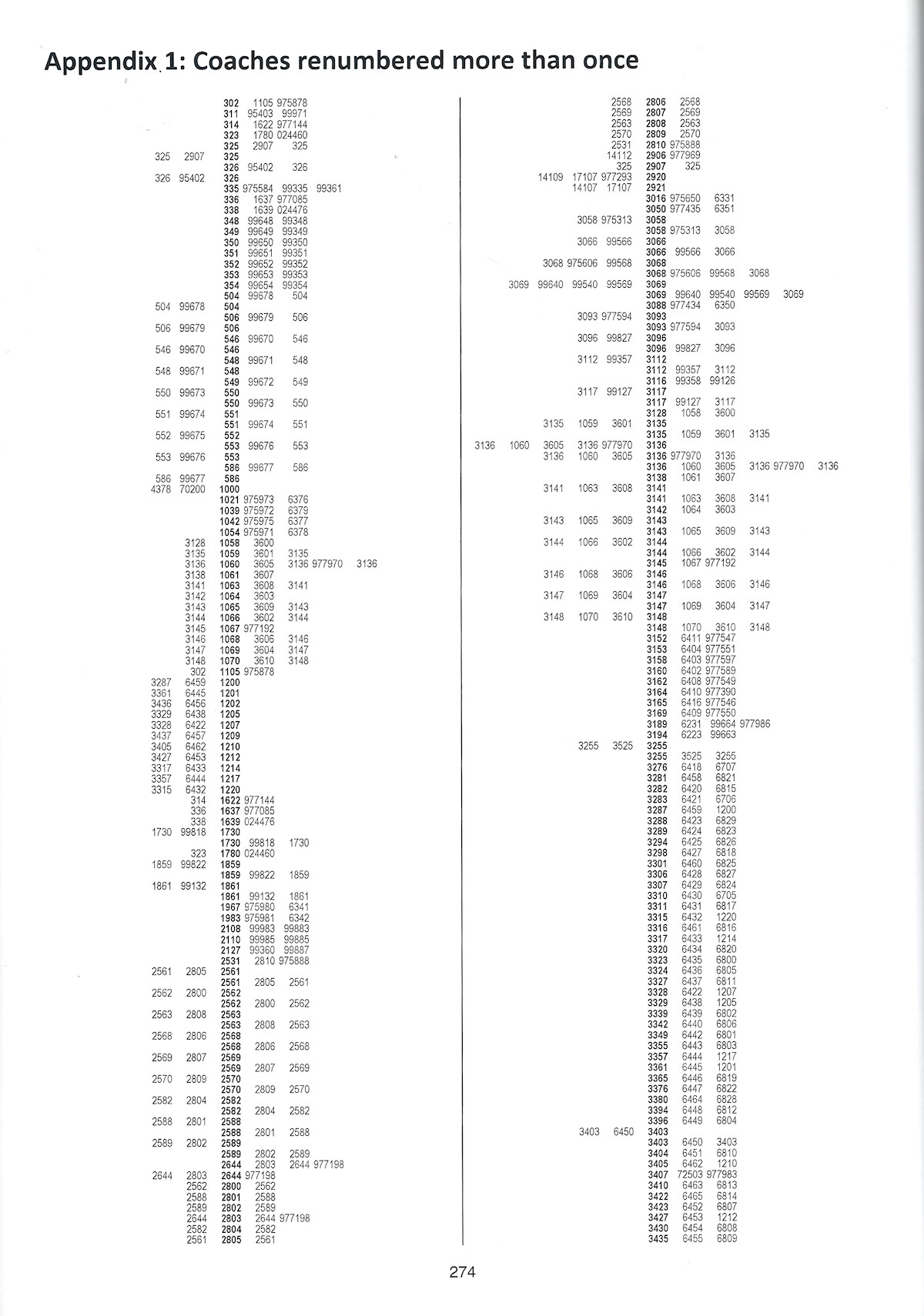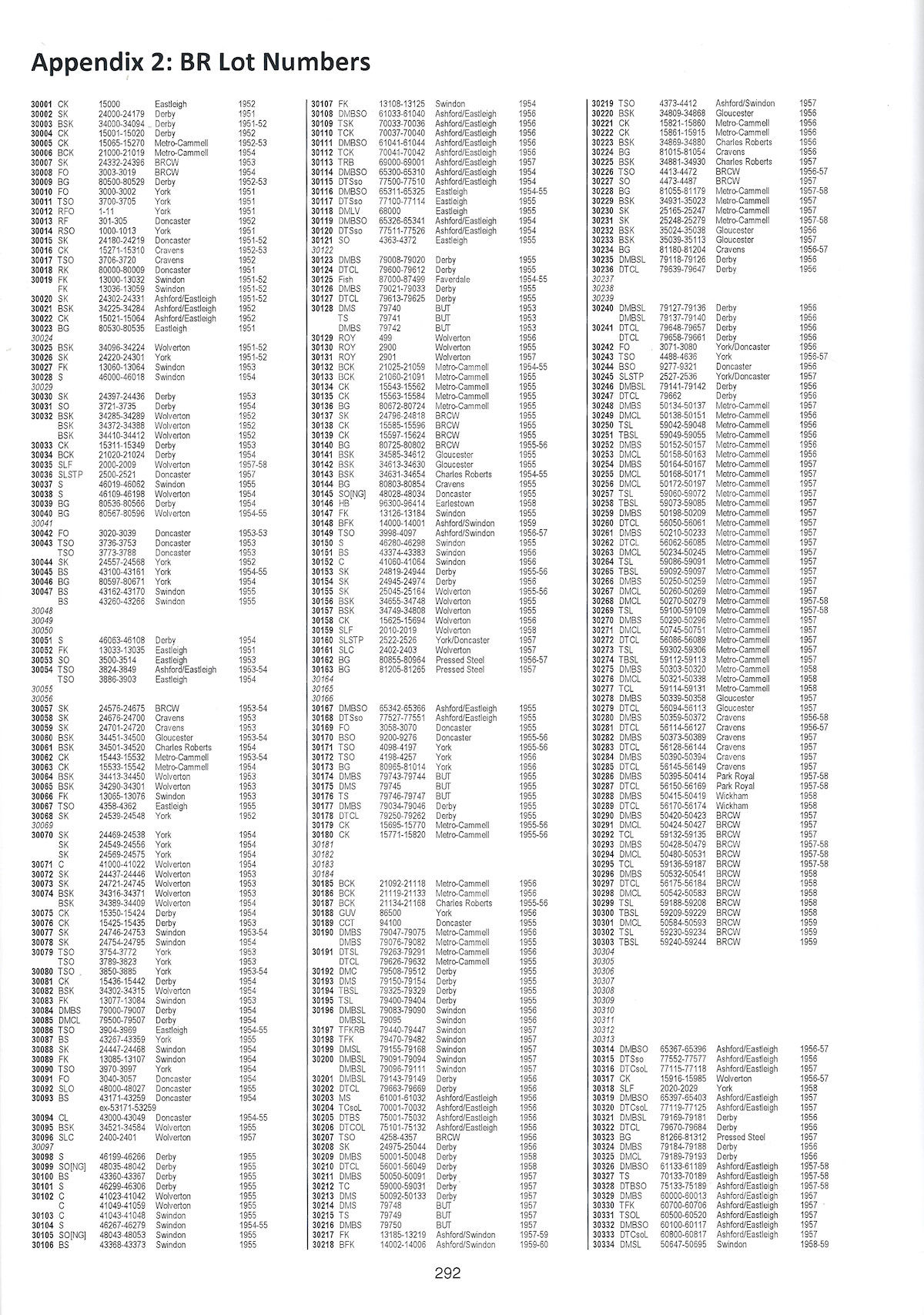 Another welcome appendix is a complete listing of BR coach lot numbers, including multiple unit vehicles. This list goes up to lot 31146 of 1995, though I have seen reference to numbers up to 31352 also being used.