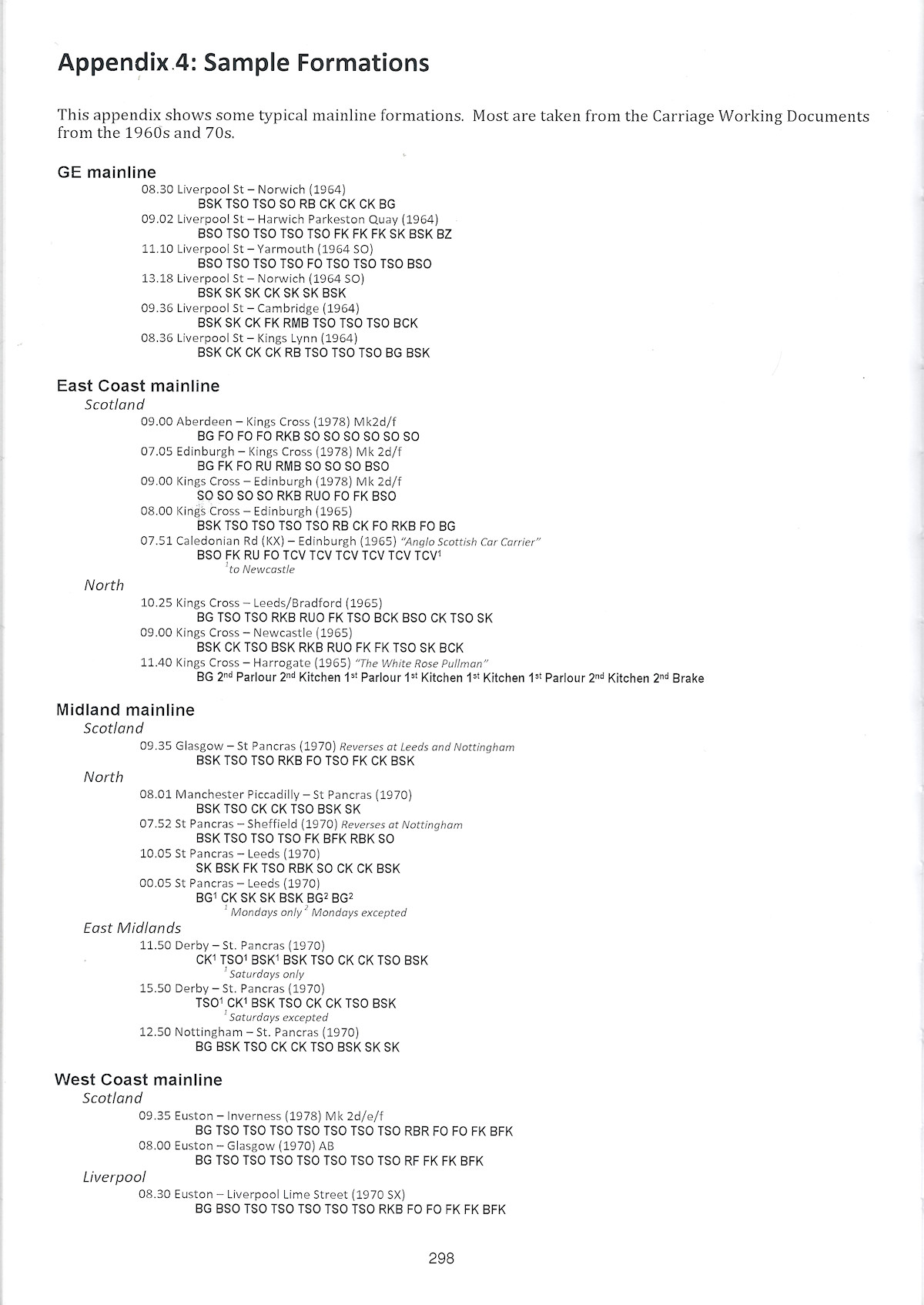 Two final appendices show train formations. The first shows scheduled formations for various routes in the period 1964 to 1978. The second (not shown here) lists the actual coach numbers in the Southern Region's fixed sets as at 1969. |