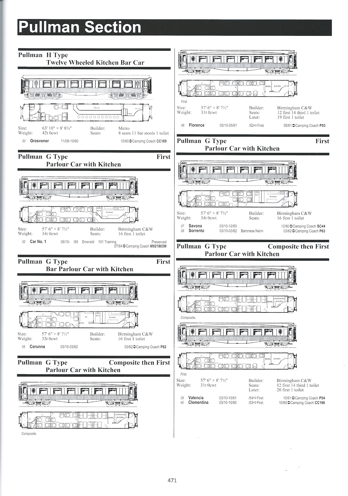 Coaches of the Pullman company were also listed. Even though many were unique, each has its own elevation and plan diagram.