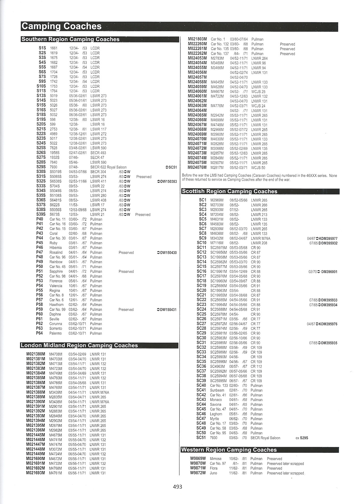 The last three pages detail the camping coaches based on each of the five regions, with dates of use and former identities. |
