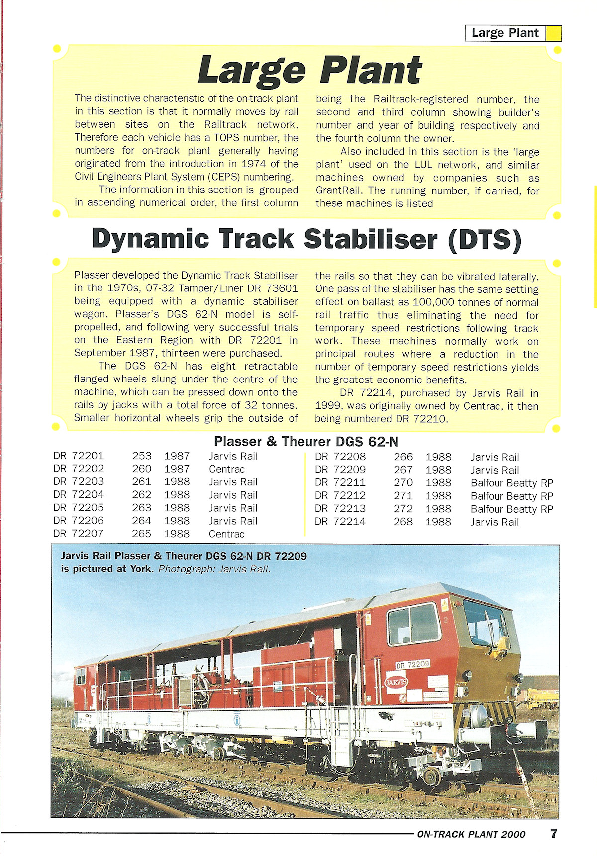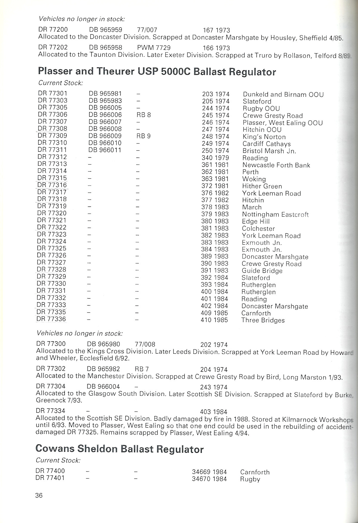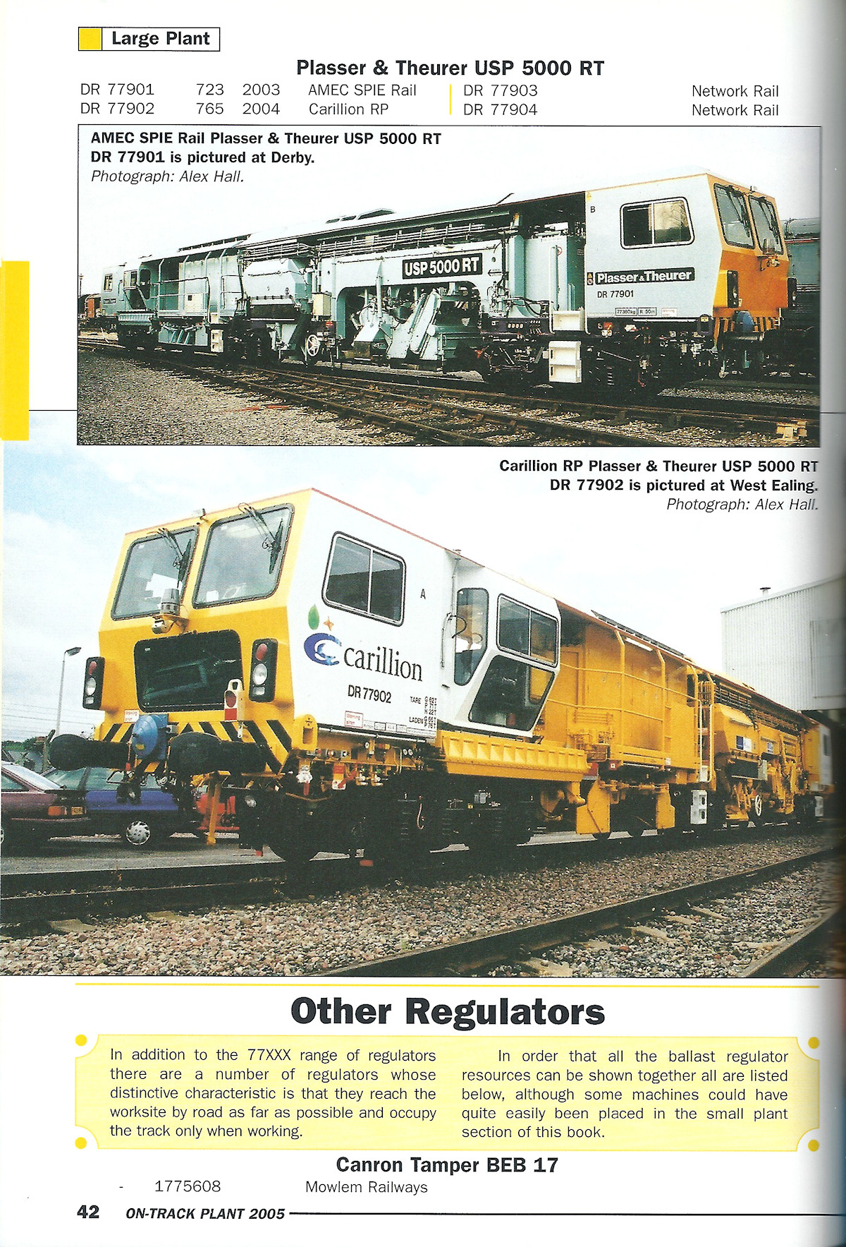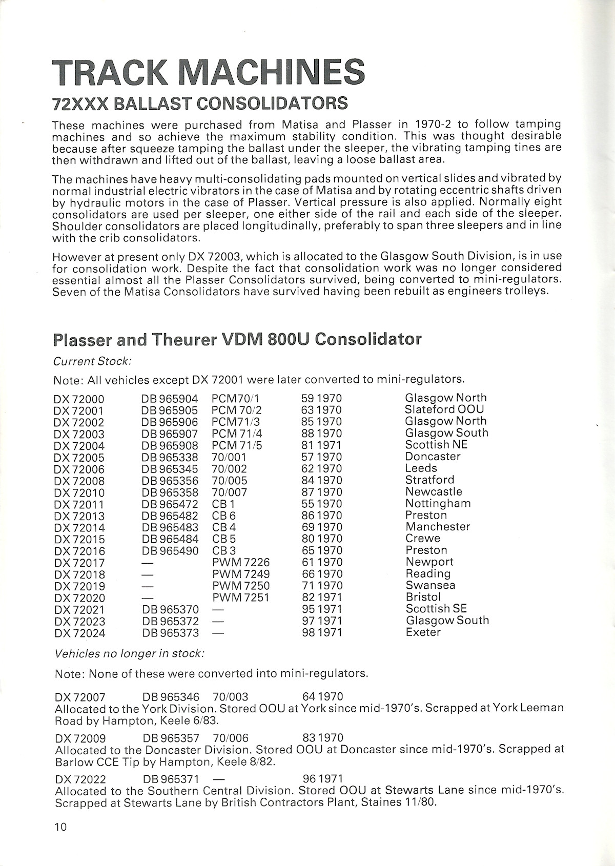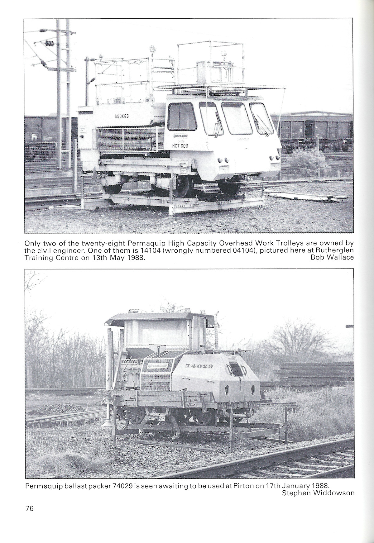 Review: | In 1984, Platform 5 published two new books detailing types of rolling stock not previously covered in mainstream books. These were 'Track Machines' and 'Departmental Coaching Stock', both written by Roger Butcher (who had recently started his 'Departmental Developments' column in Rail Enthusiast magazine). Both books were much more than just a list of numbers, and they both went on to produce several subsequent editions. Track Machines covered Trolleys, Consolidators, Tampers, Ballast Cleaners and various other rail-bourne machines large and small. Also covered were cranes, snowploughs and (in the first edition) departmental locos that were not covered in the establised loco books. The basis of the book was the CEPS (Central Engineers Plant Scheme) numbering series, although some items not allocated CEPS numbers were also included. For each item, the CEPS number and any previous DB-series and regional series numbers were given, along with the builder's serial number and year of construction. Current vehicles also showed an allocation. Also listed were all machines allocated CEPS numbers but which were no longer in stock, the same details being given along with a brief history of each item's allocations and disposal. The lists were grouped according to the type of machine, and each section was headed with a text description of the purpose, functions and development of the type. Four further editions were produced over the following decade. However, the book was evolving into something of an industry directory, reflected in the inclusion of adverts and details of contractors. From 2000, the book was published by NPT Publishing (a company set up by the author) and was only available direct from them. Much of the existing content was retained but there was an ever-growing section on contractors, giving brief details of the machines (notably road-railers) that could be hired for track work. NPT did four more editions, each larger than the one before. The last appears to have been the 2009 edition (with 304 pages!), which is still listed as current on the NPT website. |