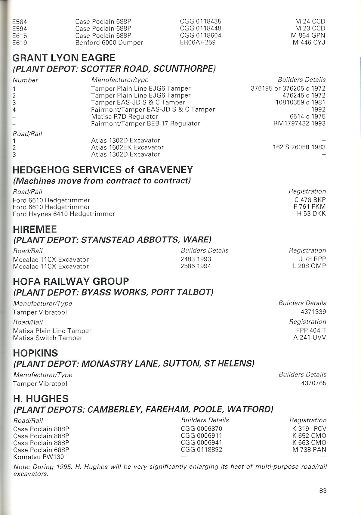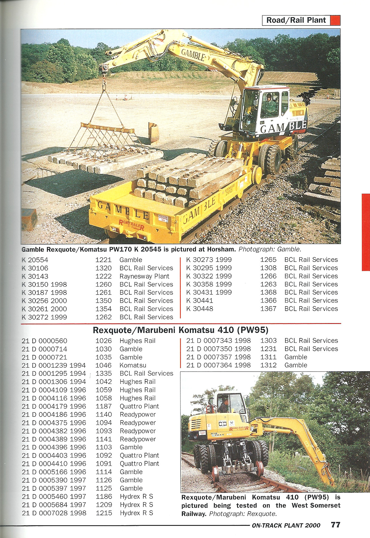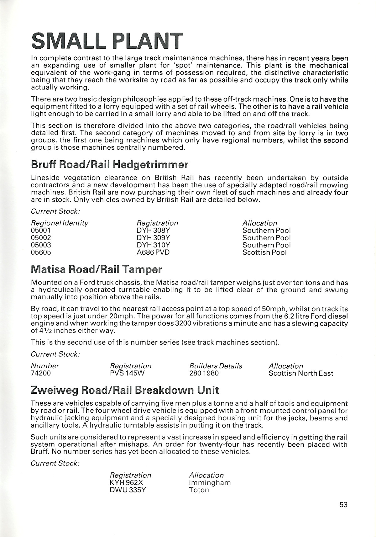 Over half of the book was devoted to Road/Railers and small plant machines, the majority of which were owned by hirers or contractors. Build numbers were still included, although road-licensed road/railers showed just the registration number and owner