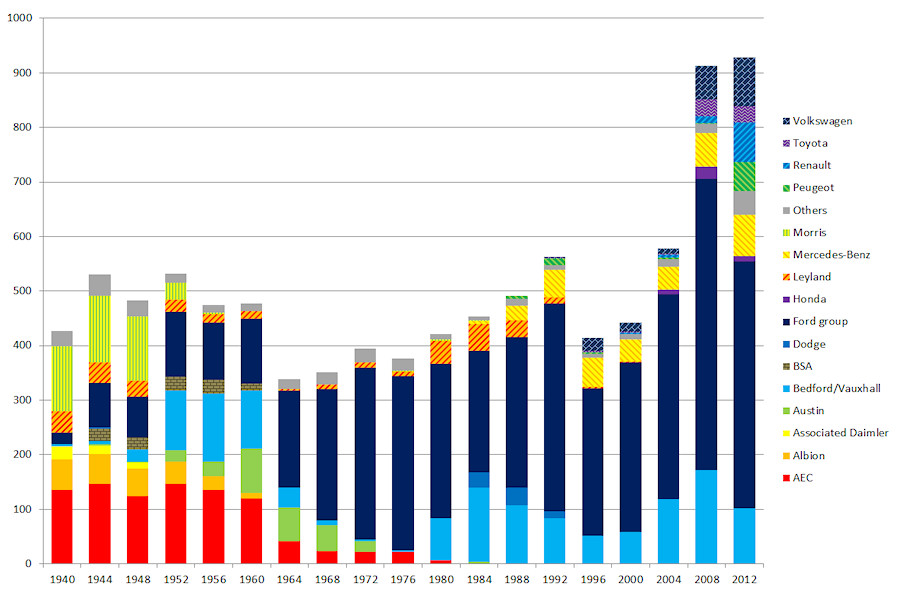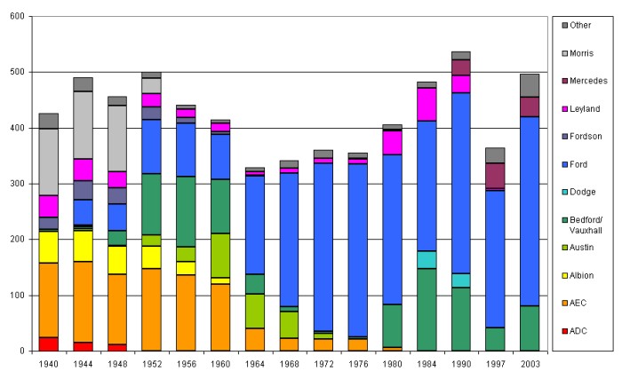 ![]() I have updated the fleet composition chart that featured in this article back in 2004. The data is now more accurate and shows the fleet composition by make at 1st January every 4 years. Apart from the significant fleet growth since 2000, the recent rise of Peugeot and Renault are also apparent. Note that this chart does not include miscellaneous items (trailers, sweepers etc) or 'private' cars. |