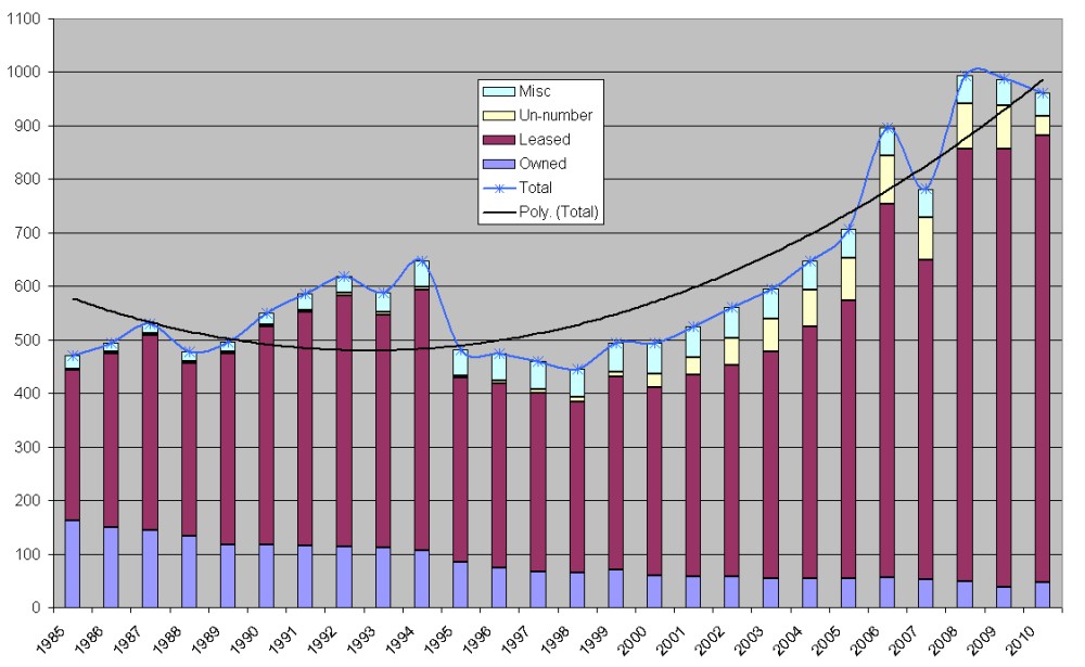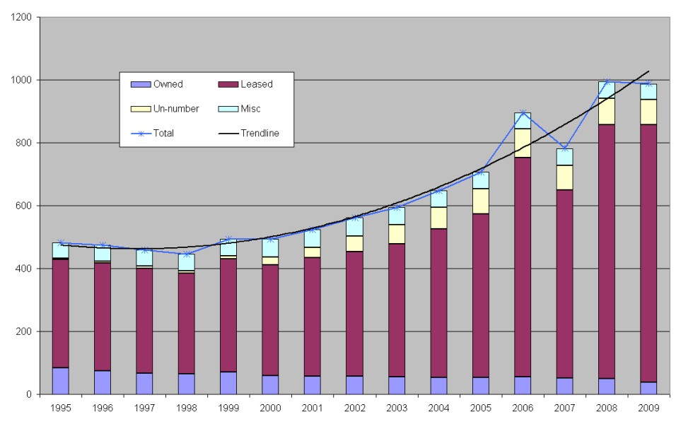![]() The chart above shows the size of the central fleet over the past 15 years (showing the breakdown between owned, leased, un-numbered and miscellaneous components). The figures for 2006 and 2008 are probably distorted upwards by a lack of official information, i.e. we had reports of new vehicles coming in but no data on vehicles leaving the fleets. As such, it can be seen that there has been fairly steady growth since about 1999, with the fleet now twice the size it was then. Figures are for April each year. Central Fleet Size Chart Extended