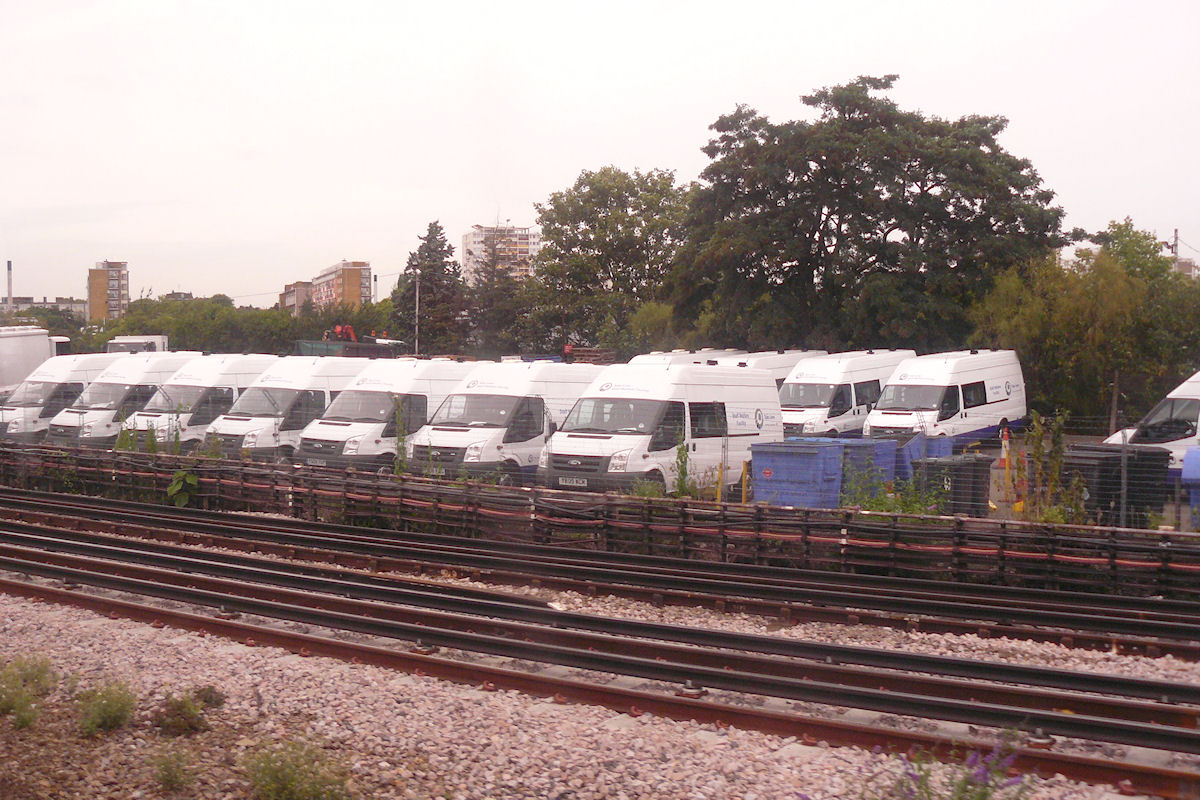 Staff Welfare Facility vans are a recent phenomenon, but the central fleet already has at least 15 examples. From mid-2009 the south end of the lorry yard at Acton Works was cleared to provide a parking space for them and this view taken on 24th August 2009 shows at least 12 such vehicles resident. Although all are based on jumbo Ford Transits, there is some variety in the liveries (white or white/blue), the side windows and the roof ventilators. All white 6727F is nearest the camera, the others on the front row being (left to right) 6463F, 6525F, 6446F, YR09GMX, 6519F and 6517F. The four at the back were not positively identified but are thought to be 6464F, 6518F, 6705F and YS09CXC. |