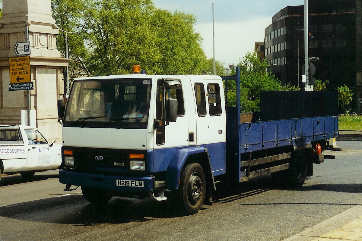 One of the last pair of original-style Ford Cargo trucks bought, 2499F (H219FLM) was a Cargo 1313 Dropside Lorry with crew-cab, tail-lift and winch. These were delivered in LUL white/blue and remained in use until 2002. Photographed at Lambeth Palace on 6th May 1997. | |||
