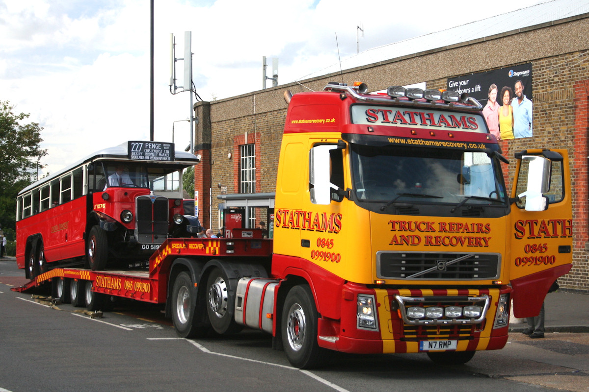 One of the exhibits at the open day held at Bromley Garage on 13th August 2016 was the LT Museum's AEC Renown six-wheel single decker LT1076. It was apparently not well enough to make the journey across from Acton itself so it hitched a lift on this low-loader. N7RMP is a Volvo FH prime-mover belonging to Stathams. Note the lifting centre-axle. The Scooter is seen being loaded back on the truck at the end of the day. |