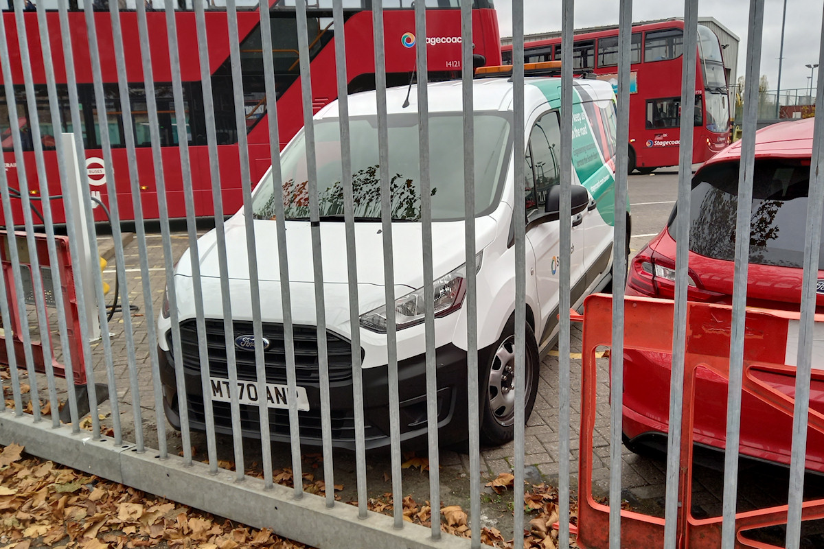 An interesting development in November 2021 was a series of vehicle swaps between Stagecoach London and Stagecoach South East. A total of six red Ford Transit Custom vans dating from 2016 were moved out of London, being swapped one-for-one with newer Ford Transit Connect vans in white. The moves were said to be to do with emissions standards, presumably to avoid London vehicles incurring ULEZ charges when attending breakdowns within the North and South Circular Roads. Barking Garage's MC16YUK (which was allocated national fleetnumber 93106 but carried 95261) now resides at Thanet, while their MT70ANP (national fleetnumber 90693) moved the other way. Bob found the newer van at Barking garage on 20th November 2021, although it was unfortunately parked hard against the fence making photography difficult. This view does show the recruitment advertising carried, this reading 'Help keep us on the road. Engineering vacancies across the South East'. |