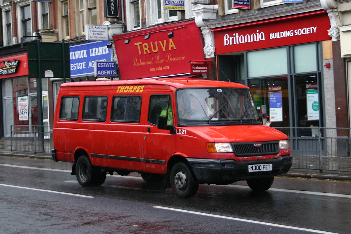 Seen in a damp Golders Green on 15th June 2005, Thorpes LD21 N300FET is an LDV Convoy minibus formerly registered T921REU. The N300FET plate (For Frank E. Thorpe) was originally carried by an Optare Excel bus used on the Stationlink service. | |||